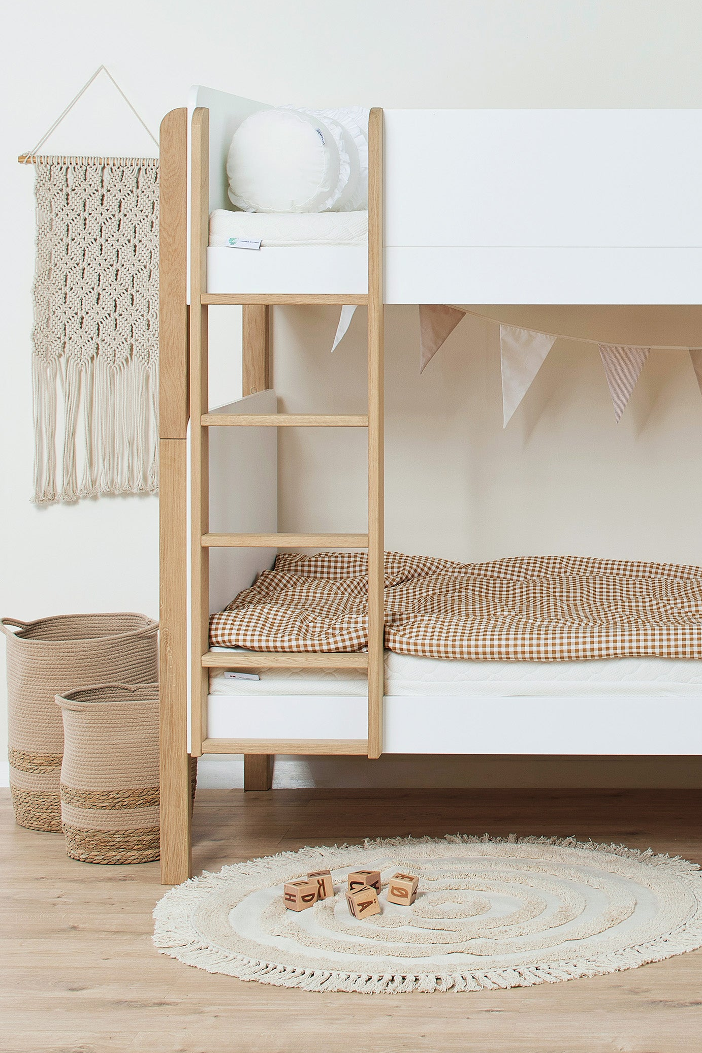 Opdag den elegante køjeseng i en perfekt kombination af funktionalitet og tidløs design. Køjesengen er fremstillet af MDF, som sikrer holdbarhed og en solid konstruktion. Benene og trappen er udført i smukt egetræ, som tilføjer en naturlig varme til sengen og værelset.