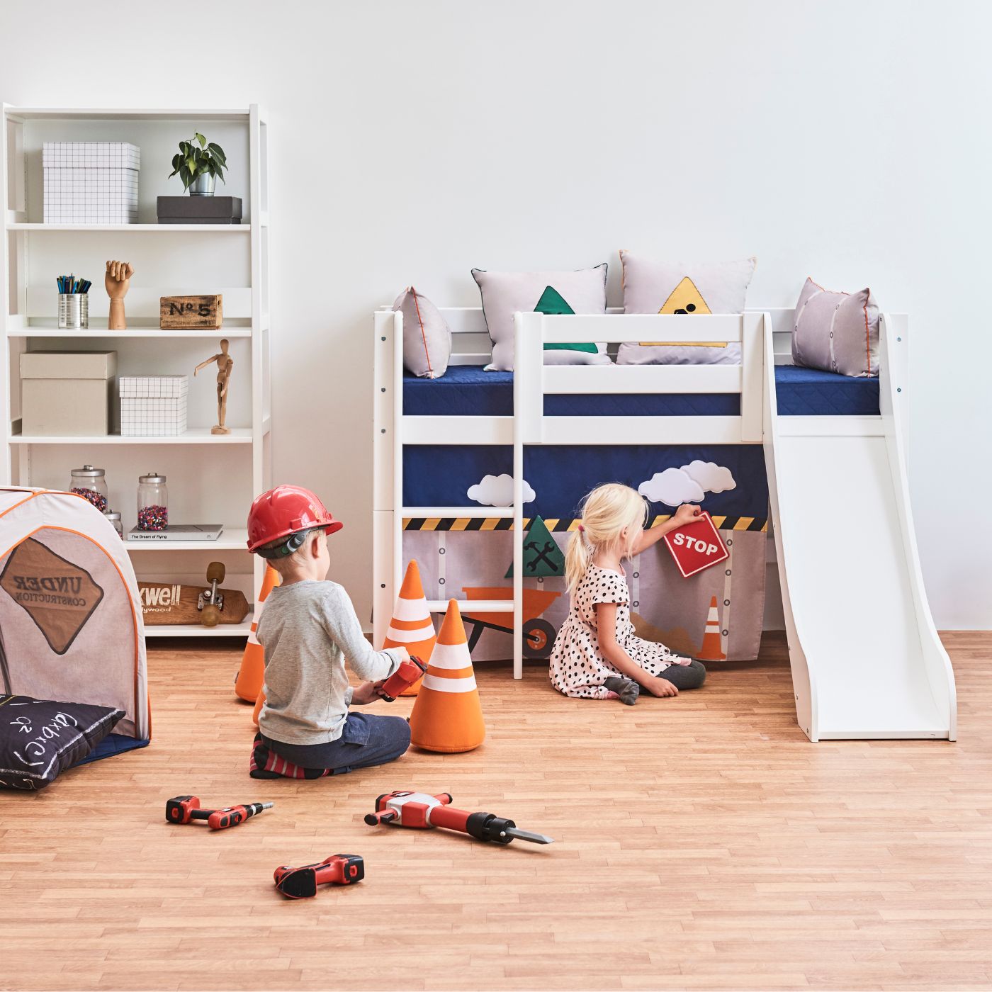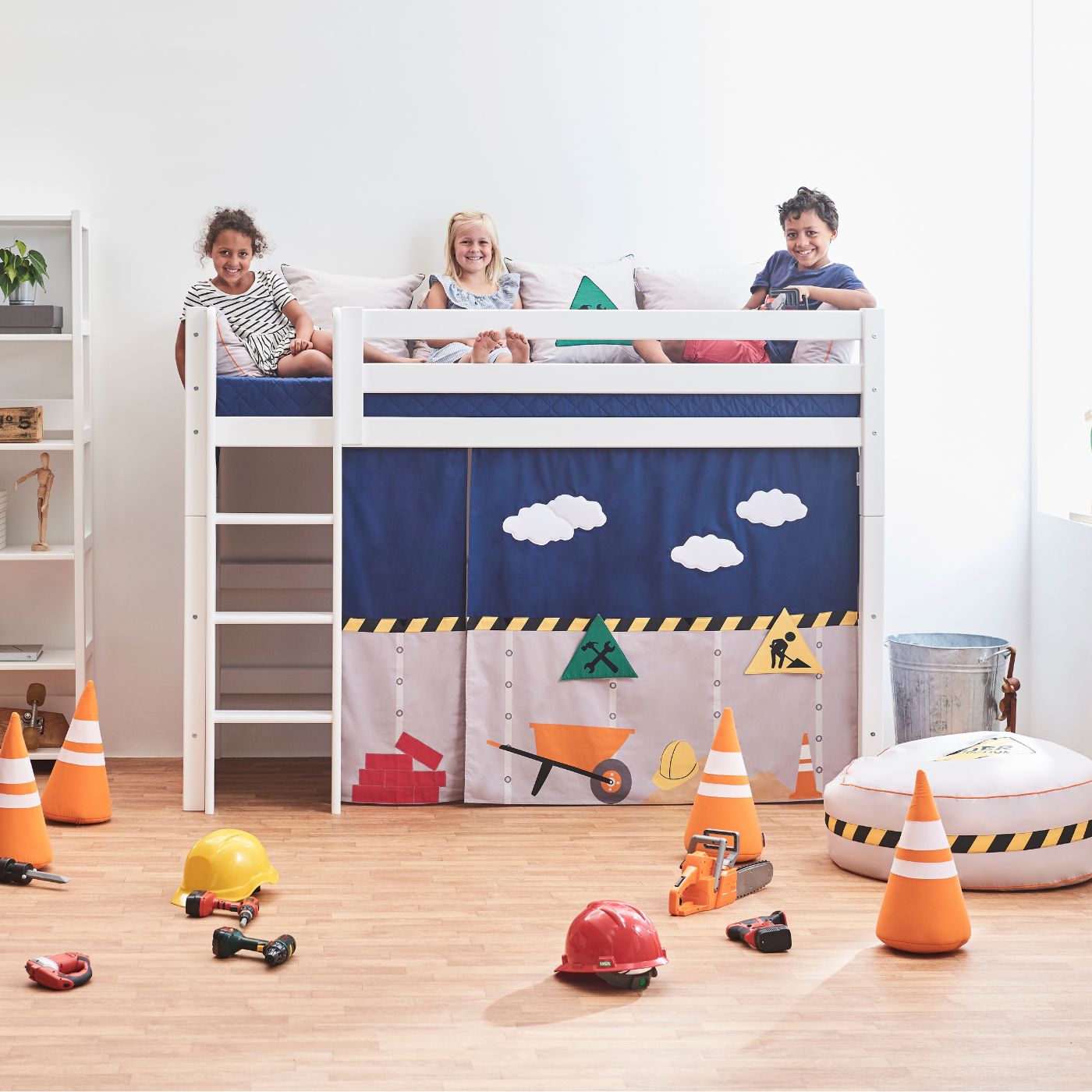 In unserer Construction-Serie findest du Vorhänge für sowohl halbhohe als auch Mittelhochbetten. Darüber hinaus enthält die Serie eine Menge Zubehör, mit dem du dein Einzelbett dekorieren kannst, sodass die Persönlichkeit des Kindes im Kinderzimmer zum Vorschein kommt.