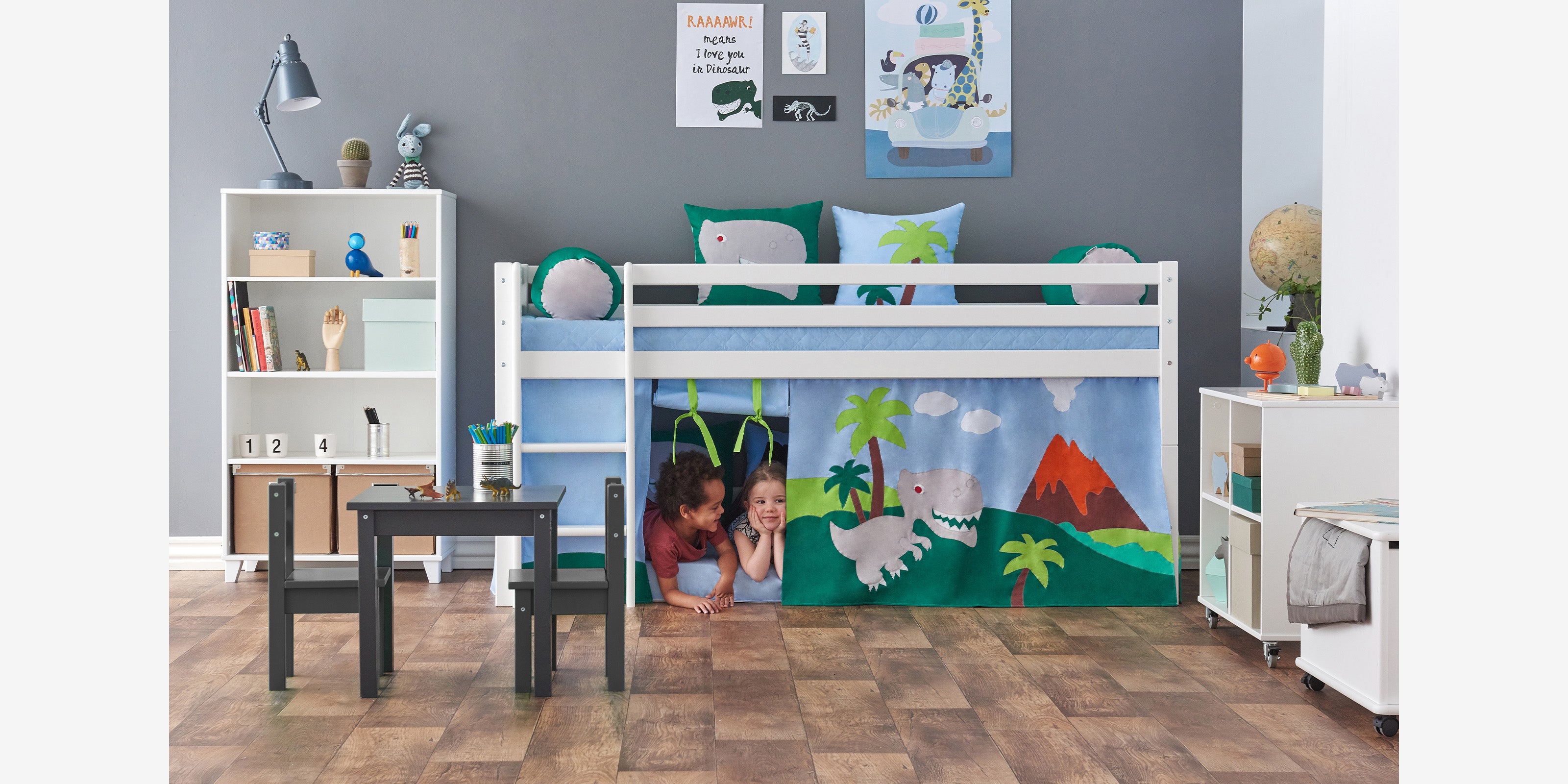 Dans notre série Dinosaur, vous trouverez des rideaux pour des lits mi-hauteurs