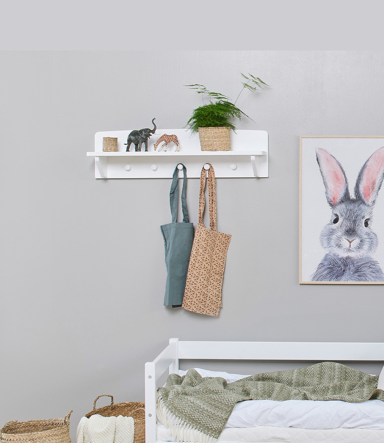 Une étagère murale peut également être équipée d'un porte-manteau sur lequel l'enfant peut accrocher ses jolies robes ou costumes. Ainsi, ils peuvent être à la hauteur de l'enfant, afin qu'il puisse les prendre et les accrocher lui-même, évitant ainsi qu'ils ne se froissent.