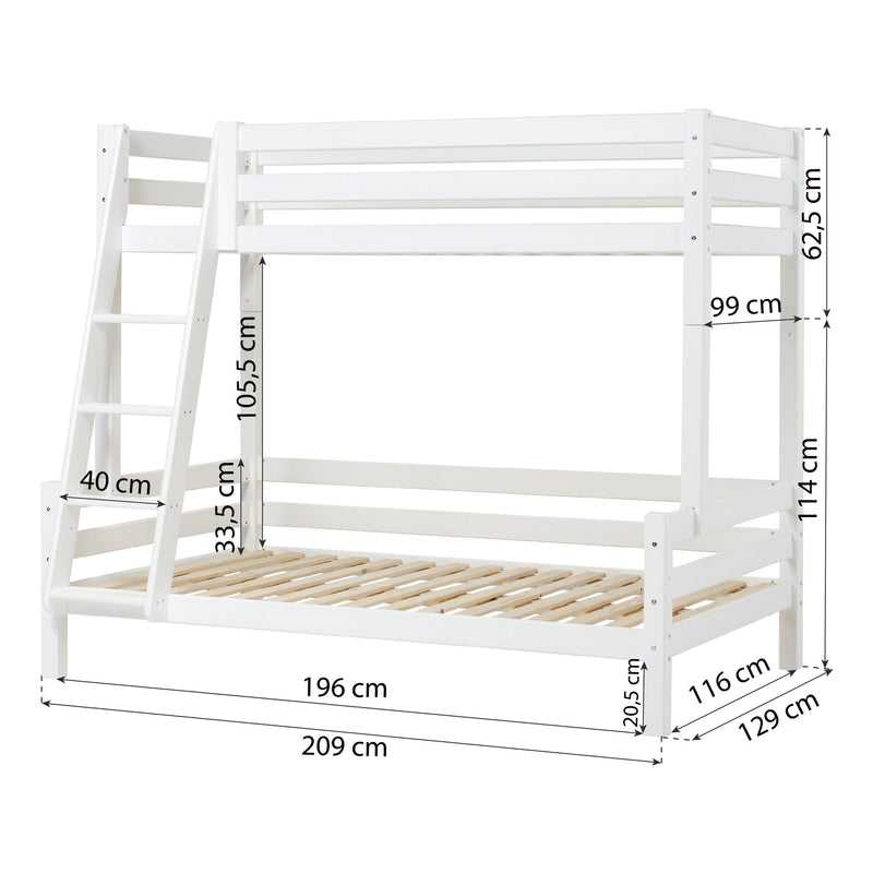 Lit superposé familial de Hoppekids avec une surface de couchage de 120x200 cm dans le lit inférieur et une surface de couchage de 90x200 cm dans le lit supérieur. Un lit familial élégant et pratique - également idéal pour une utilisation dans les maisons de vacances.