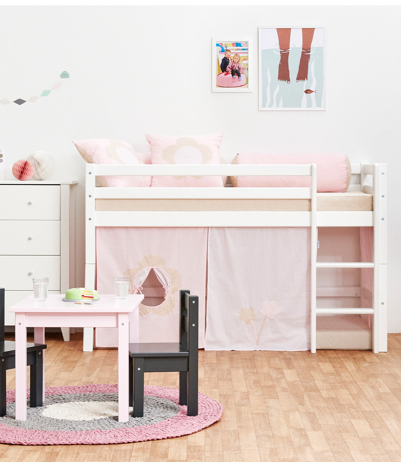 Na nossa série Fairytale Flower, você encontrará cortinas para camas altas e Camas de altura média. Além disso, a série contém muitos acessórios que você pode usar para decorar a sua Cama infantil.